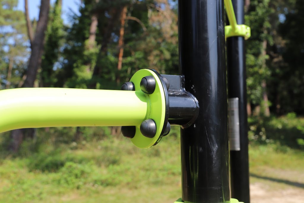 Chaque agrès est équipé d’un système de butée limitant l’amplitude du mouvement. Nous avons conçu des butées progressives, inaccessibles et amortissantes pour garantir la sécurité de tous et le confort de pratique. Ainsi, nos agrès répondent aux exigences du marché et sont contrôlés afin qu’aucun coincement de doigt ou de tête ne soit possible.