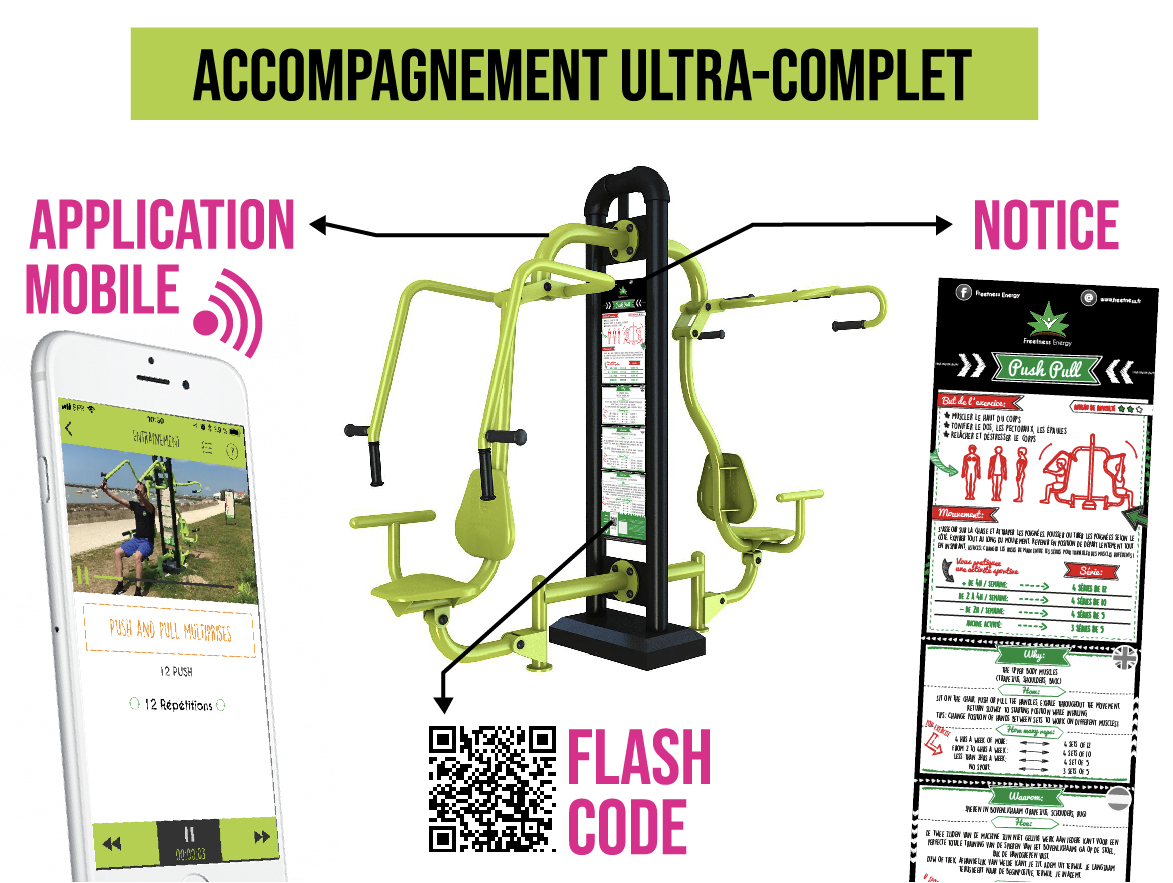 Parce que la première des sécurités est de bien utiliser les appareils, nous avons développé et équipé nos appareils de fitness de plans d’entraînements mais également de flash codes et d’une application mobile gratuite.